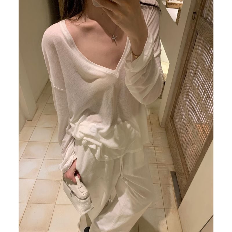 深めのVネックがデコルテを美しく見せ透け感のあるロングスリーブトップス。