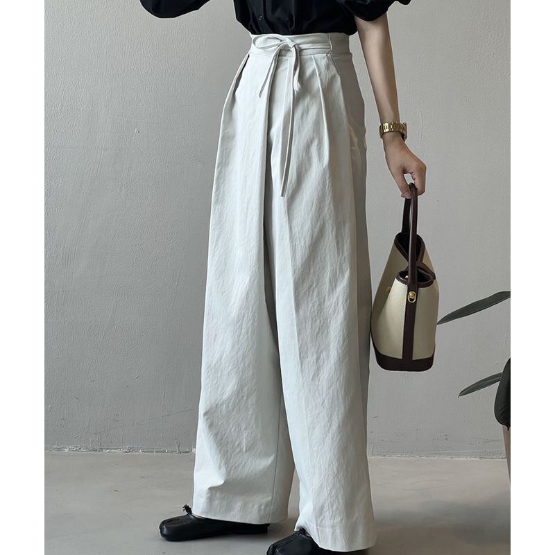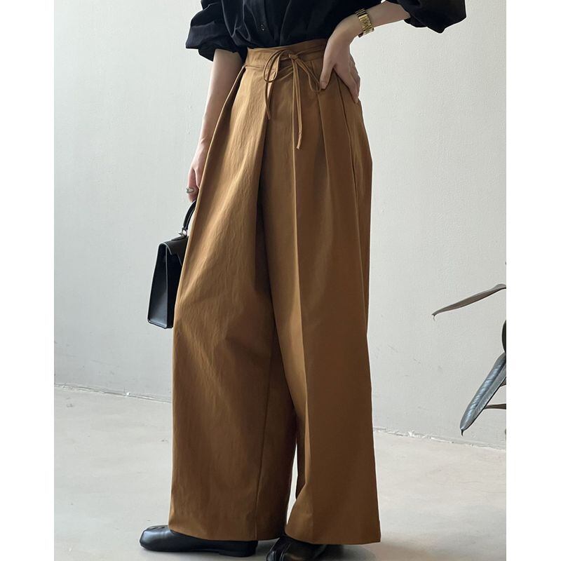 ハイウエストデザインとリボンベルトがポイントのワイドレッグパンツ。