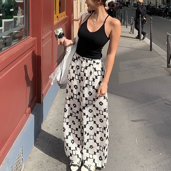 着回し力抜群のワイドレッグパンツ。幾何学模様がコーディネートにアクセントを加え、シンプルなトップスと合わせるだけでおしゃれなスタイルが完成します。程よくゆとりのあるシルエットは、動きやすく快適な着心地。休日のお出かけや、友達とのランチなど、カジュアルなシーンにもおすすめです。