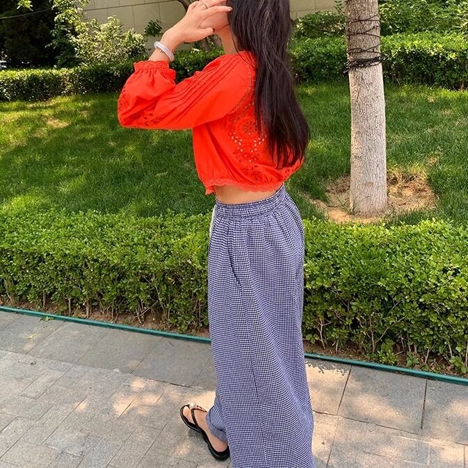 ウエストゴム仕様でリラックスした履き心地ながら、上品なギンガムチェック柄とレースのウエストコードが大人の女性らしい着こなしを演出します。